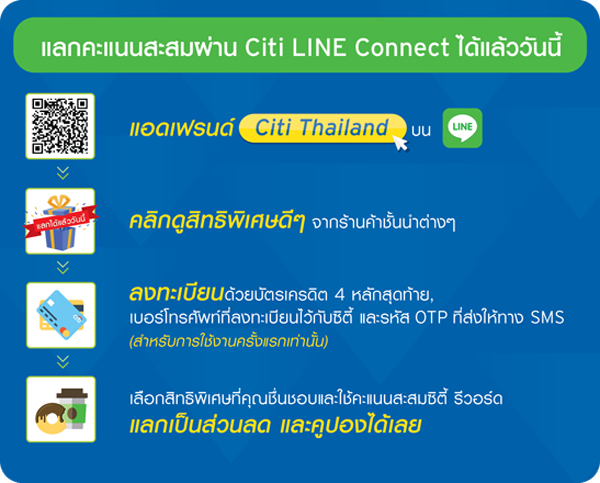 เงื่อนไขรายการส่งเสริมการขาย - Rewards Redemption บน Citi LINE Connect เป็นรายการส่งเสริมการขายที่ให้ผู้ถือบัตรสามารถแลกคะแนนสะสมในบัตรกับสินค้า และบริการ ที่ร่วมรายการภายในระยะเวลาส่งเสริมการขาย ไม่สามารถขอแลกเปลี่ยนเป็นเงินสดเพื่อชำระค่าใช้จ่ายได้โดยตรงแต่อย่างไร