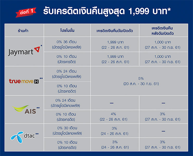 - จำกัดการรับเครดิตเงินคืนสูงุสดไม่เกิน 3,000 บาท ต่อหมายเลขบัตร ตลอดระยะเวลาส่งเสริมการตลาด เฉพาะรายการผ่อนชำระสินค้านาน 10 เดือนขึ้นไป