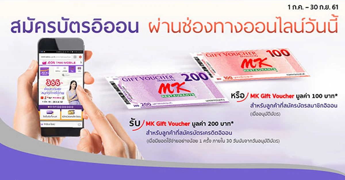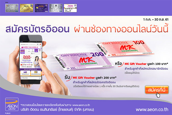 - ลูกค้าที่สมัครบัตรสมาชิกอิออนทุกประเภท (ยกเว้น บัตรสินเชื่อบิ๊กซี เอ็กซ์คลูซีฟ) ผ่านช่องทางออนไลน์ ระหว่างวันที่ 1 กรกฎาคม - 30 กันยายน 2561 รับ Gift Voucher MK มูลค่า 100 บาท/บัตร เมื่ออนุมัติบัตร - บริษัทฯ จะทำการจัดส่งของสมนาคุณให้แก่ลูกค้าตามที่อยู่ในการจัดส่งใบแจ้งการชำระเงิน ภายใน 90 วัน หลังอนุมัติบัตร