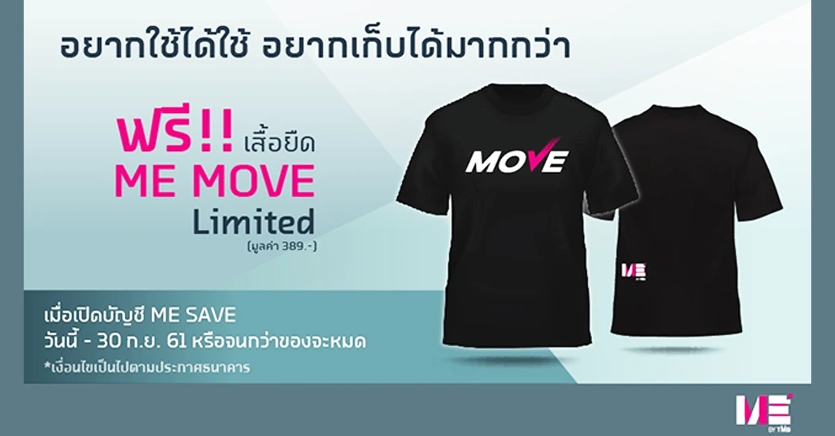 โปรโมชั่นสำหรับลูกค้าใหม่ ที่ยังไม่มีบัญชี ME...รับฟรี!! ME MOVE T-Shirt Limited มูลค่า 389 บาท