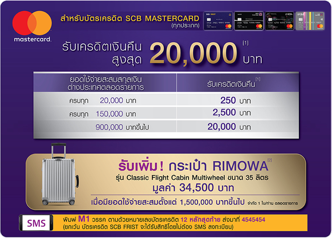 บัตรเครดิตไทยพาณิชย์... บัตรเดียว เที่ยวได้สุด ทุกมุมโลก รูดเป็นสกุลเงินต่างประเทศได้คุ้มกว่า พิเศษ! สำหรับบัตรเครดิต SCB MASTERCARD (ทุกประเภท) รับเครดิตเงินคืนสูงสุด 20,000 บาท เมื่อใช้จ่ายสะสมเป็นสกุลเงินต่างประเทศตามที่กำหนด (ยกเว้น ยอดใช้จ่ายออนไลน์)