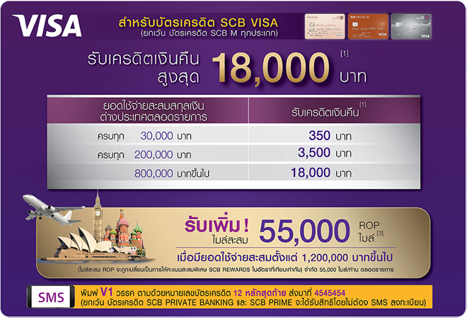 สำหรับบัตรเครดิต SCB VISA (ยกเว้น บัตรเครดิต SCB M ทุกประเภท) รับเครดิตเงินคืนสูงสุด 18,000 บาท เมื่อใช้จ่ายสะสมเป็นสกุลเงินต่างประเทศตามที่กำหนด