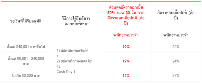 - หลังจากสิ้นสุดระยะเวลาส่วนลดอัตราดอกเบี้ย 50% นาน 30 วันแล้ว อัตราดอกเบี้ยจะถูกปรับเป็นอัตราดอกเบี้ยปกติตามวงเงินที่ลูกค้าได้รับอนุมัติ