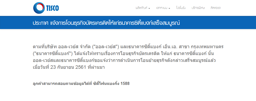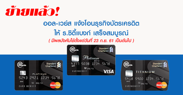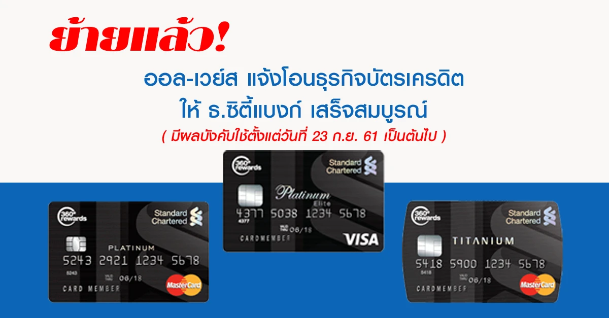 ย้ายแล้ว! ออล-เวย์ส แจ้งโอนธุรกิจบัตรเครดิตให้ ธ.ซิตี้แบงก์ เสร็จสมบูรณ์ มีผลตั้งแต่ 23 ก.ย. 61 เป็นต้นไป