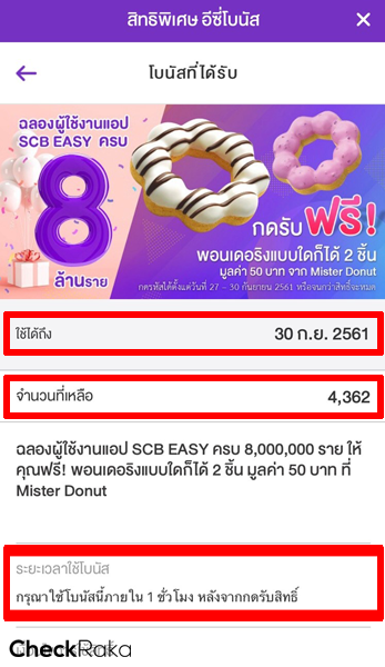 4.1 อ่านรายละเอียดและเงื่อนไขต่างๆ ของการใช้สิทธิ์ เช่น ระยะเวลาใช้สิทธิ์, จำนวนสิทธิ์ที่เหลืออยู่ และระยะเวลาการใช้โบนัส ซึ่งกำหนดไว้ไม่เกิน 1 ชม. หลังจากกดรับสิทธิ์แล้ว