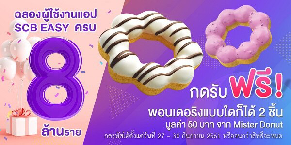 วันนี้เราจะพาไปดูเรื่องง่ายๆ สไตล์ SCB Easy App กันค่ะ นั่นก็คือ เรื่องของการรับสิทธิพิเศษ SCB Easy Bonus นั่นเอง.. สำหรับเพื่อนๆ คนไหนที่ใช้ Application ของธนาคารไทยพาณิชย์ คงจะคุ้นเคยและรู้กันว่า เราสามารถรับสิทธิพิเศษง่ายๆ ในแอปฯ SCB EASY และล่าสุดกับการฉลองผู้ใช้งานแอปฯ ครบ 8 ล้านราย นั้น ทางธนาคารฯ เค้าก็ใจดี แจกโดนัทพอนเดอริง 2 ชิ้น ฟรี! มูลค่า 50 บาท จาก Mister Donut ด้วยนะคะ