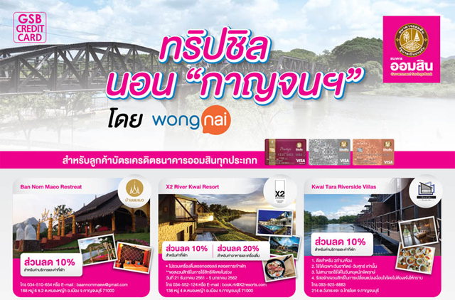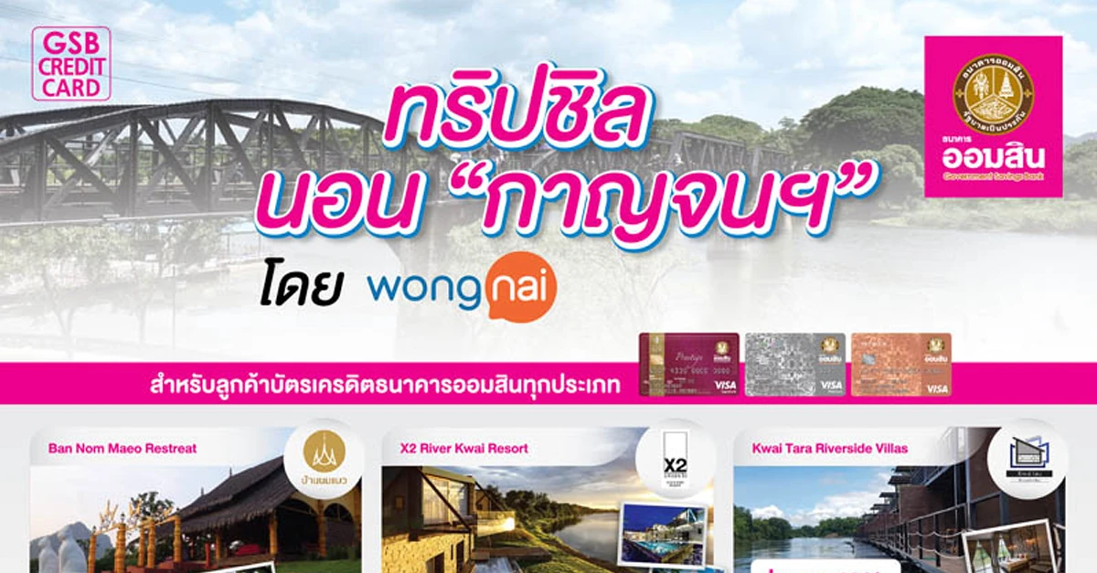 ทริปชิล นอน "กาญจนฯ" โดย WongNai สิทธิพิเศษสำหรับลูกค้าบัตรเครดิตธนาคารออมสิน รับส่วนลดสูงสุด 30% พร้อมห้องพักราคาพิเศษ นอนชิลๆ ริมน้ำ เที่ยวชมเมืองกาญจนบุรี