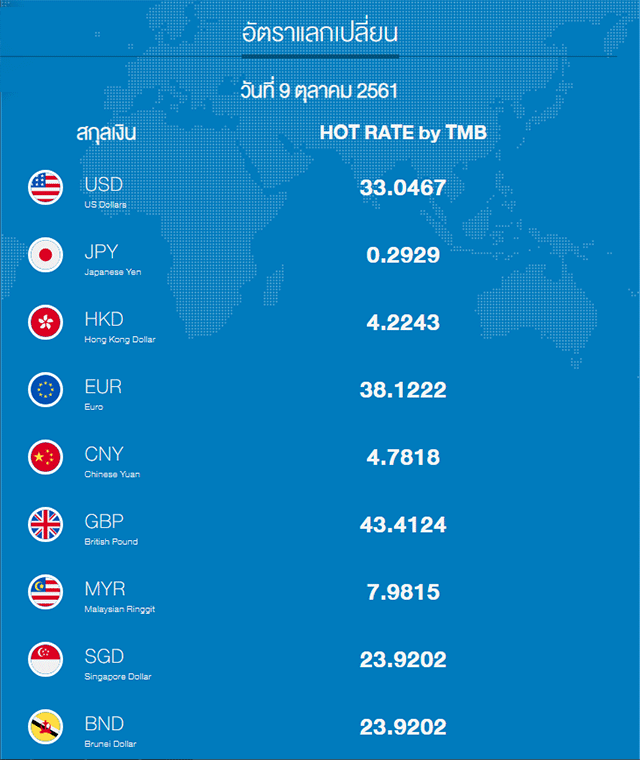 ตัวอย่างอัตราแลกเปลี่ยนประจำวันที่ 9 ตุลาคม 2561