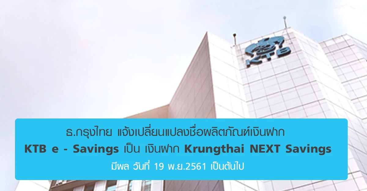 บมจ. ธนาคารกรุงไทย จะมีการเปลี่ยนแปลงชื่อผลิตภัณฑ์เงินฝาก KTB e-Savings มาเป็น เงินฝาก Krungthai NEXT Savings โดยมีผลบังคับใช้ตั้งแต่วันที่ 19 พฤศจิกายน 2561 เป็นต้นไป