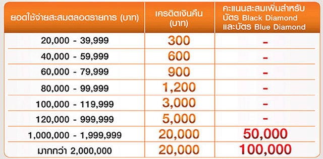 1,000,000 - 1,999,999 บาท จะได้รับ 50,000 คะแนนพิเศษเพิ่ม (สำหรับสมาชิกบัตรฯ ประเภทไม่มีคะแนนสะสมจะได้รับเครดิตเงินคืน 5,000 บาท)