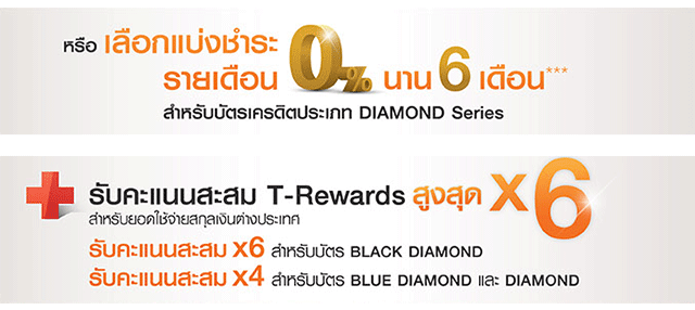 - แจ้งความประสงค์แบ่งชำระสำหรับ บัตร BLACK DIAMOND โทร. 02-217-5222 บัตร BLUE DIAMOND โทร. 02-217-5557 บัตร Diamond โทร. 1770