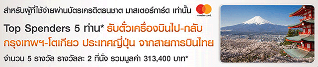 *เงื่อนไข Top Spenders - สิทธิพิเศษสำหรับผู้ที่ใช้จ่ายผ่านบัตรเครดิตธนชาต มาสเตอร์การ์ด ที่มียอดใช้จ่ายสะสมตลอดรายการ สูงสุด 5 อันดับแรก ขั้นต่ำ 500,000 บาท (คำนวณจากการใช้จ่ายผ่านบัตรหลักและบัตรเสริมรวมกัน) ตามที่ปรากฏในระบบของธนาคาร รับตั๋วเครื่องบินไป- กลับ โตเกียว ประเทศญี่ปุ่น (รวมภาษี) จากสายการบินไทย จำนวน 5 รางวัล รางวัลละ 2 ที่นั่ง มูลค่ารวม 313,400 บาท (ราคาตั๋วเครื่องบินอาจมีการเปลี่ยนแปลงขึ้นอยู่กับวันและเวลาในการบิน)
