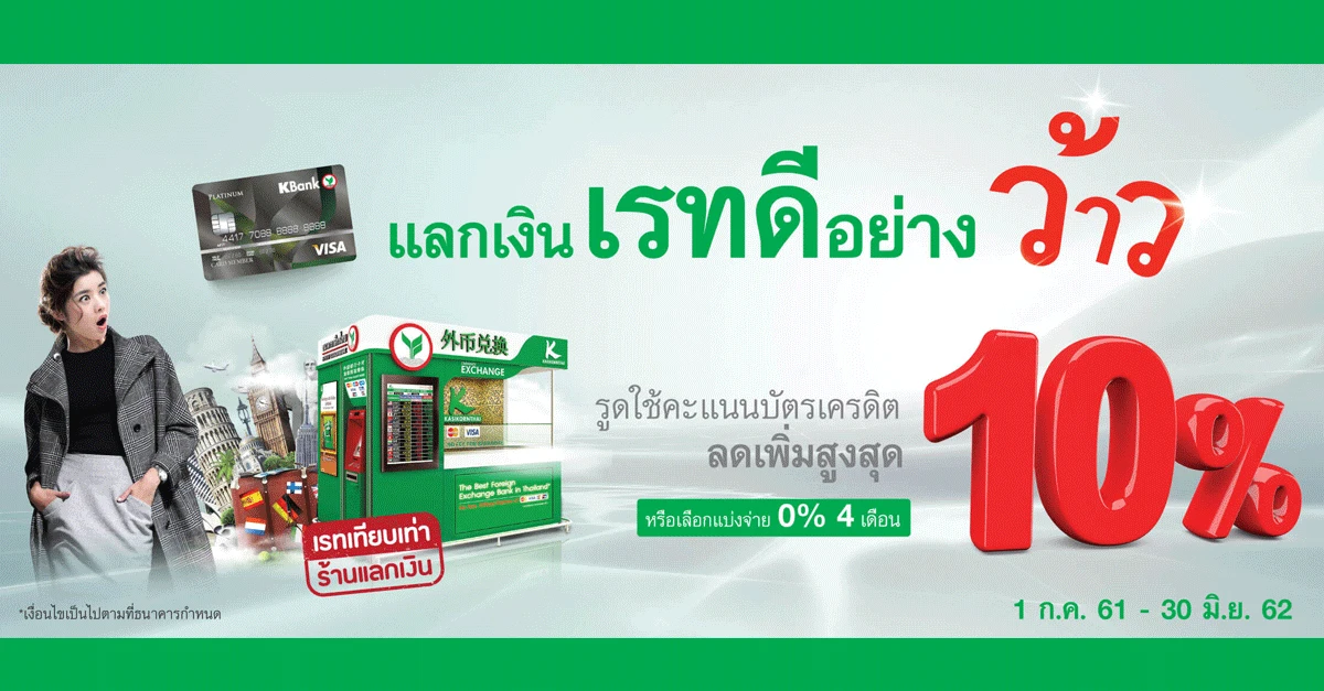 บัตรเครดิตกสิกรไทย ณ สำนักงานแลกเปลี่ยนเงินต่างประเทศ ที่ท่าอากาศยานสุวรรณภูมิ ดอนเมือง ภูเก็ต เชียงใหม่ และสาขาที่ร่วมรายการ รับสิทธิ์แบ่งจ่าย 0% นาน 4 เดือน ไม่ชาร์จเพิ่ม หรือเลือกใช้คะแนนบัตรเครดิตกสิกรไทย แลกรับส่วนลดสูงสุด 10%