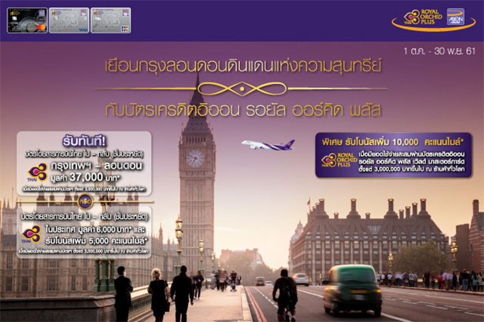 • เมื่อชำระค่าสินค้า และ/หรือบริการ ผ่านบัตรเครดิตอิออน รอยัล ออร์คิด พลัส เวิลด์ มาสเตอร์การ์ด หรือบัตรเครดิตอิออน รอยัล ออร์คิด พลัส แพลทินัม สะสมครบ 3,000,000 บาทขึ้นไป ณ ร้านค้าทั่วโลก รับบัตรโดยสารสายการบินไทย ชั้นประหยัดไป-กลับ กรุงเทพฯ - ลอนดอน จำนวน 1 ที่นั่ง มูลค่า 37,000 บาท หรือ