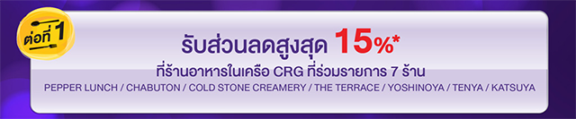 สมาชิกบัตรเครดิตไทยพาณิชย์ อร่อยทุกมื้อ ฟิน 2 ต่อ ที่ 7 ร้านดังในเครือ CRG (เปปเปอร์ ลันซ์, ชาบูตง ราเมน, COLD STONE, The Terrace, YOSHINIYA, เทนยะ และคัตสึยะ)