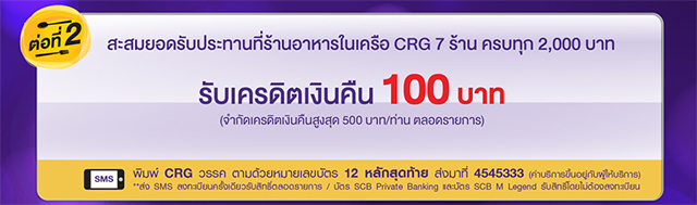 1. รายการส่งเสริมการขายนี้ สำหรับผู้ถือบัตรเครดิตไทยพาณิชย์ทุกประเภท ยกเว้นบัตรเครดิตนิติบุคคล เมื่อใช้จ่ายผ่านบัตรเครดิต ณ ร้านอาหารในเครือ CRG ที่ร่วมรายการ ได้แก่ เปปเปอร์ ลันซ์, ชาบูตง ราเมน, COLD STONE, The Terrace, YOSHINIYA, เทนยะ และคัตสึยะ โดยสะสมยอดใช้จ่าย ณ ร้านอาหารทั้ง 7 ร้านดังกล่าว ครบทุก 2,000 บาท รับเครดิตเงินคืน 100 บาท (จำกัดเครดิตเงินคืนสูงสุด 500 บาท/ท่าน ตลอดรายการ) ระหว่างวันที่ 1 ตุลาคม - 31 ธันวาคม 2561