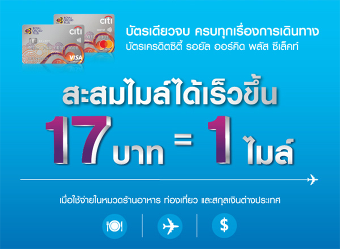 บัตรเดียวจบ ครบทุกเรื่องการเดินทาง กับ บัตรเครดิตซิตี้ รอยัล ออร์คิด พลัส ซีเล็คท์ สะสมไมล์ได้เร็วขึ้น 17 บาท = 1 ไมล์ เมื่อใช้จ่ายในหมวดร้านอาหาร ท่องเที่ยว และสกุลเงินต่างประเทศ