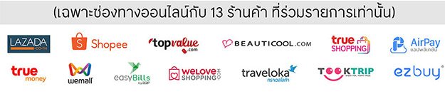 ![]() (เมื่อช้อปผ่าน แอปพลิเคชัน ลาซาด้า เท่านั้น) | ลูกค้าที่ลงทะเบียนซื้อสินค้ากับ Lazada ครั้งแรก รับส่วนลด 15% เมื่อช้อปตั้งแต่ 699 บาท ขึ้นไป/เซลล์สลิป (จำกัดส่วนลดสูงสุด 499 บาท/เซลล์สลิป) โค้ดส่วนลด TSCLAZ499 | ลูกค้า Lazada ปัจจุบัน รับส่วนลด 8% เมื่อช้อปตั้งแต่ 1,199 บาท ขึ้นไป/เซลล์สลิป (จำกัดส่วนลดสูงสุด 399 บาท/เซลล์สลิป) โค้ดส่วนลด TSCLAZ399 |