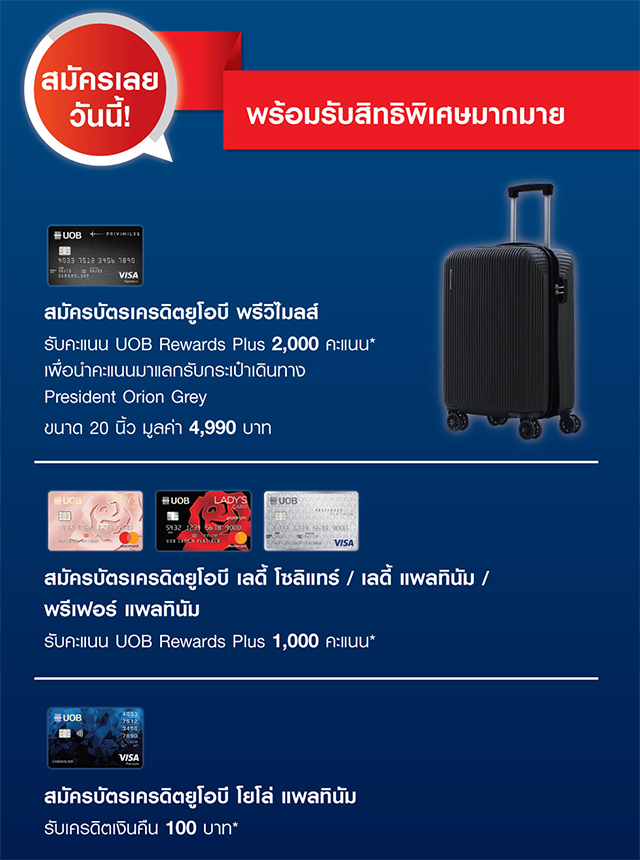 • สมัครได้ที่ธนาคารยูโอบีทุกสาขาทั่วประเทศ ช่องทางออนไลน์ หรือโทร. 02-089-9999