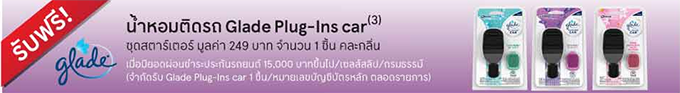 รับฟรี! น้ำหอมติดรถ Glade Plug-Ins Car ชุดสตาร์ทเตอร์ มูลค่า 249 บาท จำนวน 1 ชิ้น คละกลิ่น เมื่อมียอดผ่อนชำระประกันภัยรถยนต์ 15,000 บาทขึ้นไป/เซลล์สลิป/กรมธรรม์ (จำกัดรับ Glade Plug-Ins Car 1 ชิ้น/หมายเลขบัญชีบัตรหลัก ตลอดรายการ)
