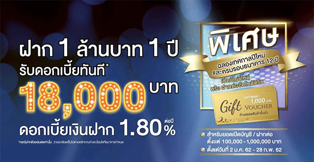 ฉลองเทศกาลปีใหม่ และครบรอบธนาคาร 12 ปี สำหรับผู้ที่เปิดบัญชีเงินฝากออมทรัพย์เพิ่มค่าทันใจ หรือ บัญชีเงินฝากออมทรัพย์เพิ่มค่าทันใจที่ครบกำหนดและฝากต่อ รับ Gift Vouchers ห้างสรรพสินค้าชั้นนำสูงสุด 1,000 บาท