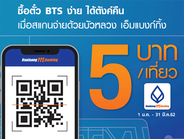 โปรโมชั่นพิเศษจาก ธนาคารกรุงเทพ รับเงินคืน 5 บาท/เที่ยวเดินทาง เมื่อซื้อตั๋ว BTS และสแกน QR CODE ชำระค่าตั๋วด้วยบัวหลวง เอ็มแบงก์กิ้ง