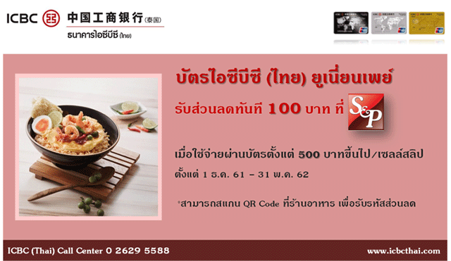 ลูกค้าบัตรเครดิตไอซีบีซี (ไทย) รับส่วนลดทันที 100 บาท ที่ S&P เมื่อรับประทานอาหารครบ 500 บาทขึ้นไป/เซลล์สลิป *สามารถสแกน QR Code ที่ร้านอาหาร เพื่อรับรหัสส่วนลด