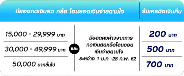 เงื่อนไข - เฉพาะสมาชิกซิตี้ เรดดี้เครดิตเท่านั้น รับเครดิตเงินคืน 200 บาท เมื่อมียอดกดเงินสด หรือโอนยอดเงินจ่ายตามใจรวม 15,000 - 29,999 บาท หรือรับเครดิตเงินคืน 500 บาท เมื่อมียอดรวม 30,000 - 49,999 บาท หรือรับเครดิตเงินคืน 700 บาท เมื่อมียอดรวม 50,000 บาทขึ้นไป มียอดคงค้างจากการกดเงินสดหรือโอนยอดเงินจ่ายตามใจภายใน 1 ม.ค. - 28 ก.พ. 62