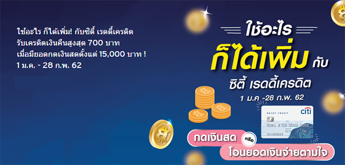 1 ม.ค. - 28 ก.พ. 62 รับเครดิตเงินคืนสูงสุด 700 บาท เมื่อกดเงินสด หรือโอนเงิน จากบัญชีซิตี้ เรดดี้เครดิต