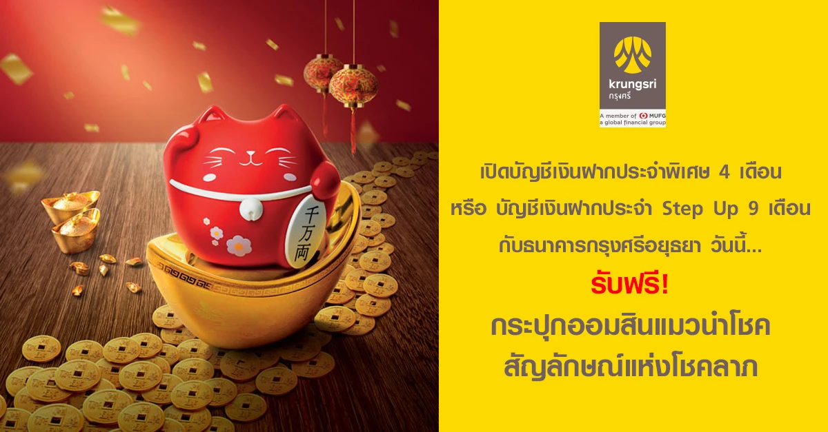เปิด บัญชีเงินฝากประจำพิเศษ 4 เดือน หรือ บัญชีเงินฝากประจำ Step up 9 เดือน กับธนาคารกรุงศรีอยุธยาวันนี้ รับฟรี! กระปุกออมสินแมวนำโชค สัญลักษณ์แห่งโชคลาภ (มูลค่า 250 บาท)