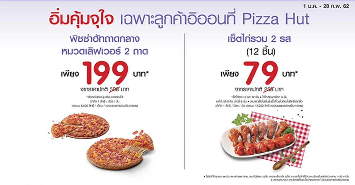 - รับสิทธิ์ซื้อพิซซ่าฮัทถาดกลางหมวดเลิฟเวอร์ 2 ถาด เพียง 199 บาท (เลือกแป้งหนานุ่มหรือบางกรอบได้) เพียงชำระผ่านบัตรเครดิตอิออน รอยัล ออร์คิด พลัส, บัตรเครดิตอิออน โกลด์ และ บัตรเครดิตอิออน คลาสสิค (สูงสุด 1 สิทธิ์ / บัตร / วัน และรวม 8,000 สิทธิ์ / เดือน / ตลอดรายการส่งเสริมการขาย)
