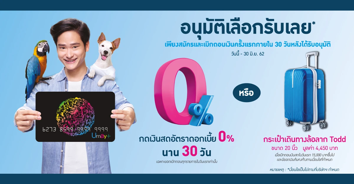 กดเงินสดผ่านบัตรยูเมะพลัสวันนี้ รับดอกเบี้ย 0% นาน 30 วัน หรือเลือกรับกระเป๋าเดินทาง Todd