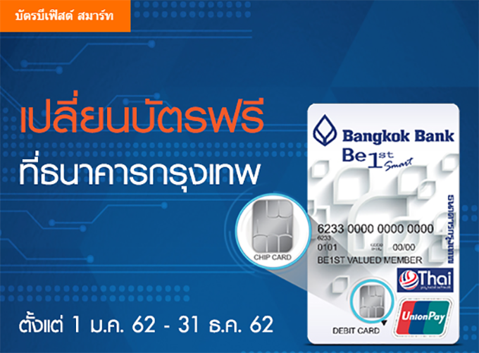 ปลอดภัย มั่นใจ ใช้บัตรชิปการ์ด...ฟรี! ค่าธรรมเนียมเปลี่ยนบัตรที่ ธ.กรุงเทพ ตั้งแต่ 1 ม.ค. 62 - 31 ธ.ค. 62