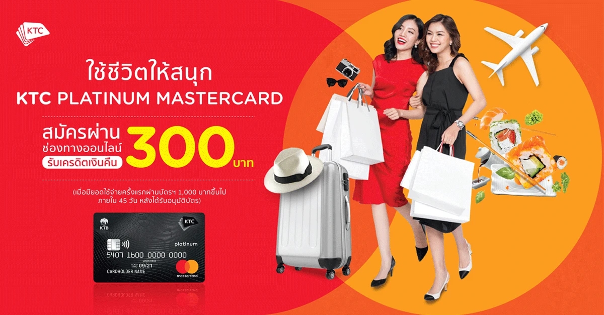 บัตรเครดิต KTC PLATINUM MASTERCARD วันนี้! *รับเครดิตเงิน 300 บาท เมื่อสมัครผ่านช่องทางออนไลน์ที่กำหนด พร้อมดาวน์โหลด KTC mobile และมียอดใช้จ่ายตั้งแต่ 1,000 บาทขึ้นไป 1 ครั้ง ภายใน 45 วันหลังจากได้รับการอนุมัติบัตรฯ