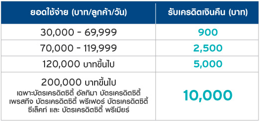 - เครดิตเงินคืนจะถูกบันทึกในบัญชีบัตรหลักภายใน 60 วัน หลังจากจบรายการ โดยสมาชิกฯ ต้องคงสภาพสมาชิกฯ จนถึงวันที่ทำรายการมอบเงินคืน