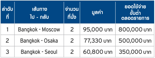 - ต่อที่ 3 รับบัตรโดยสารการบินไทยชั้นประหยัด เส้นทางระหว่างประเทศ สำหรับลูกค้าที่มียอดใช้จ่ายผ่านบัตรฯ สะสมสูงสุด ตลอดรายการผ่าน www.thaiairways.com