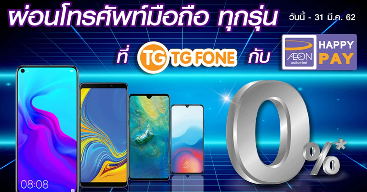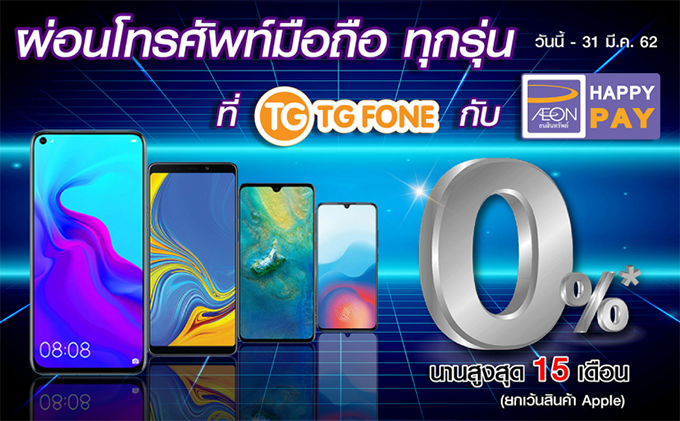 ผ่อนมือถือ 0% นานสูงสุด 15 เดือน กับ AEON HAPPY PAY ที่ TG FONE วันนี้ - 31 มี.ค. 62