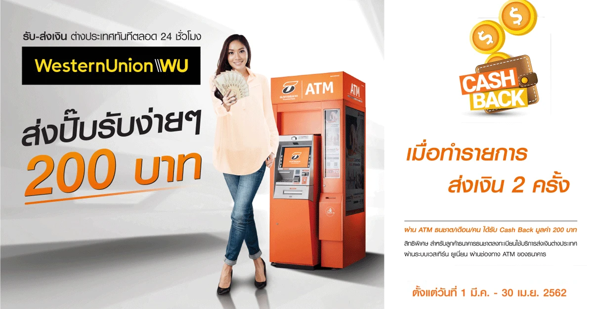 เงื่อนไขรายการส่งเสริมการตลาด - สิทธิพิเศษสำหรับลูกค้า รับเครดิตเงินคืนเข้าบัญชี 200 บาท ที่ทำธุรกรรมส่งเงินต่างประเทศผ่านระบบ เวสเทริน์ยูเนี่ยน ผ่านช่องทางธนชาต ATM ภายในเดือนเดียวกันอย่างน้อย 2 ครั้ง