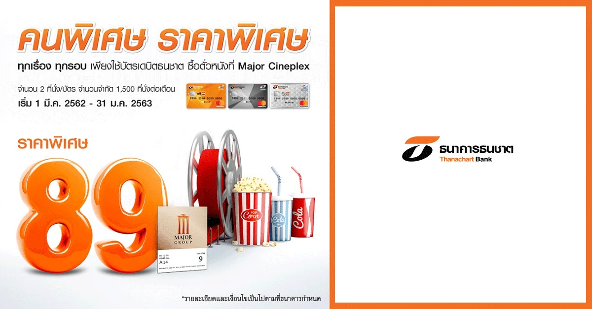 บัตรเดบิตธนชาต ซื้อตั๋วหนังที่ Major Cineplex จำนวน 2 ที่นั่ง/บัตร จำกัด 1,500 ที่นั่งต่อเดือน