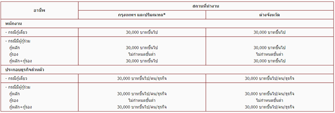 ข้อตกลงและเงื่อนไข สำหรับรายได้ 30,000 บาทขึ้นไป - สำหรับพนักงานประจำที่มีรายได้ประจำตั้งแต่ 20,000 บาทขึ้นไป และเมื่อรวมรายได้ทั้งหมดแล้วต้อง 30,000 บาทขึ้นไป