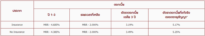 - กรณีสมัครทำประกันชีวิต (MRTA) ต้องสมัครทำประกันชีวิตขั้นต่ำ 70% ของวงเงินสินเชื่อ ระยะเวลาความคุ้มครองขั้นต่ำ 10 ปี หรือ สูงสุดไม่เกินระยะเวลากู้ กรณีกู้ไม่ถึง 10 ปี