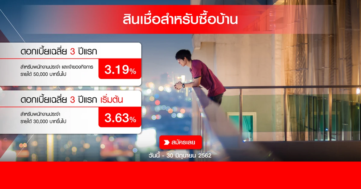สินเชื่อสำหรับซื้อบ้าน - ดอกเบี้ยเฉลี่ย 3 ปีแรก 3.19% สำหรับพนักงานประจำ และเจ้าของกิจการ รายได้ 50,000 บาทขึ้นไป
