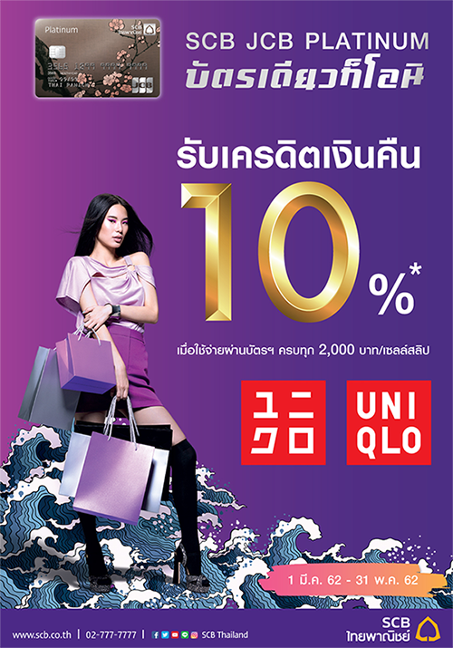 โปรโมชั่นพิเศษ จากบัตรเครดิต SCB JCB PLATINUM ให้คุณรับเครดิตเงินคืน 10% ที่ Uniqlo เมื่อใช้จ่ายผ่านบัตรฯ ครบทุก 2,000 บาท/เซลล์สลิป