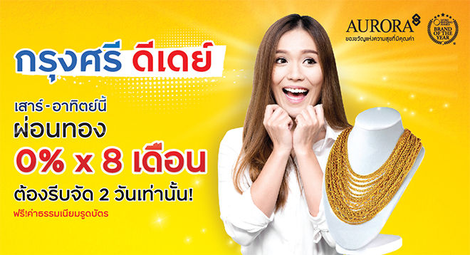 2 วันเท่านั้น!! กรุงศรี ดีเดย์ บัตรเครดิตในเครือกรุงศรี ผ่อนทองรูปพรรณที่ Aurora  0% นาน 8 เดือน พร้อมฟรี! ค่าธรรมเนียมการรูดบัตร หรือเลือกผ่อนด้วยอัตราดอกเบี้ยพิเศษสบายๆ นานสูงสุด 10 เดือน