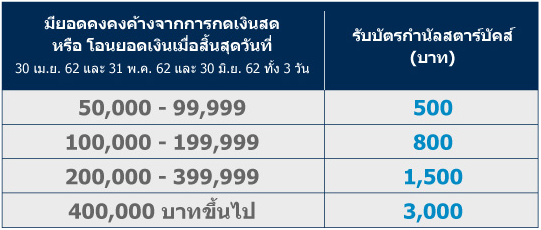 - เมื่อสมาชิกมียอดคงค้างจากการกดเงินสด หรือ โอนยอดเงินจ่ายตามใจ ณ สิ้นวันของวันที่ 30 เม.ย. 62 / 31 พ.ค. 62 และ 30 มิ.ย. 62 ทั้ง 3 วัน แต่ละวันมียอดฯ ตั้งแต่ 50,000 - 99,999 บาท รับบัตรกำนัลสตาร์บัคส์มูลค่า 500 บาท 100,000 - 199,999 บาท รับบัตรกำนัลสตาร์บัคส์มูลค่า 800 บาท 200,000 - 399,999 บาท รับบัตรกำนัลสตาร์บัคส์มูลค่า 1,500 บาท หรือ ยอดคงค้างตั้งแต่ 400,000 บาทขึ้นไป รับบัตรกำนัลสตาร์บัคส์มูลค่า 3,000 บาท