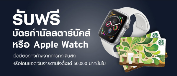 - รับฟรี! บัตรกำนัลสตาร์บัคส์ มูลค่าสูงสุด 3,000 บาท เมื่อมียอดคงค้างจากการกดเงินสด หรือโอนยอดเงินจ่ายตามใจตั้งแต่ 50,000 บาทขึ้นไป