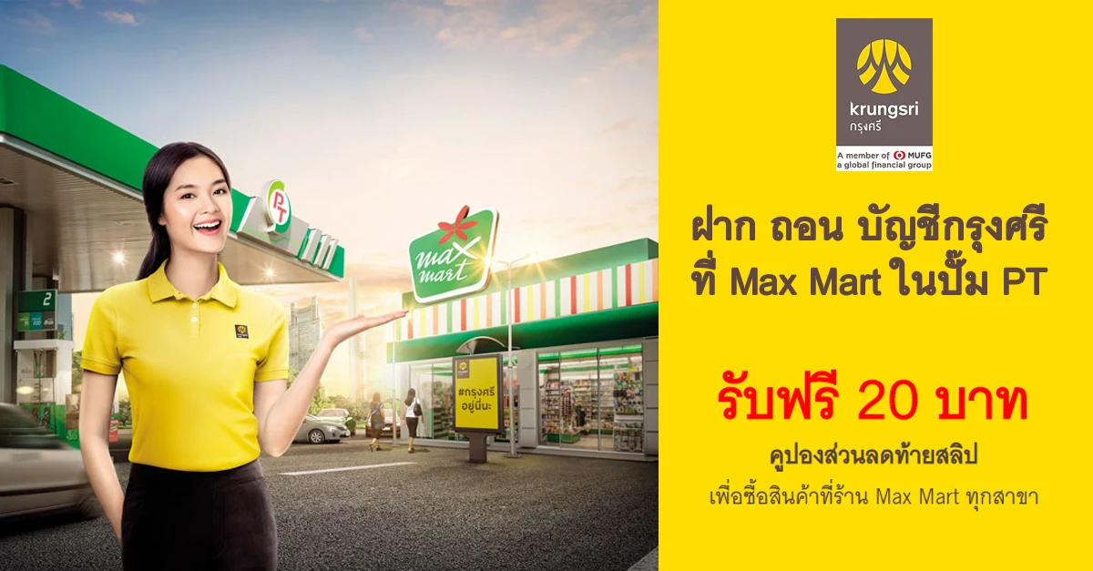 ฝาก ถอน บัญชีกรุงศรี ที่ Max Mart ในปั๊ม PT รับฟรีคูปองส่วนลดท้ายสลิป 20 บาท