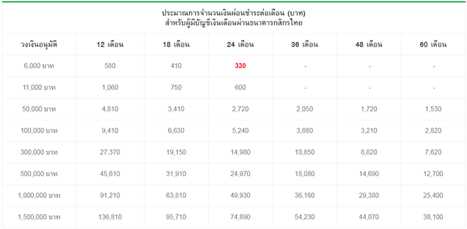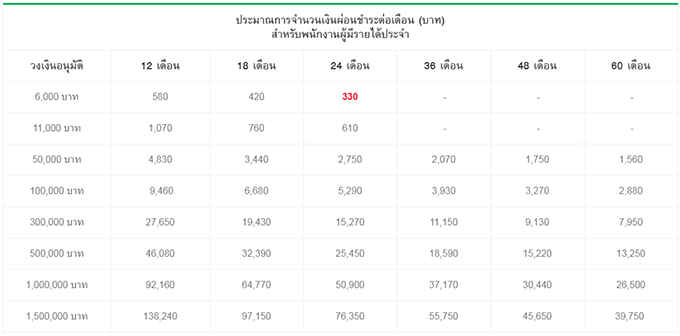 - ผ่อนชำระเงินสินเชื่อเริ่มต้น 330 บาทต่อเดือน คำนวณมาจากวงเงินอนุมัติขั้นต่ำ 6,000 บาท ระยะเวลาผ่อนชำระที่ 24 เดือน