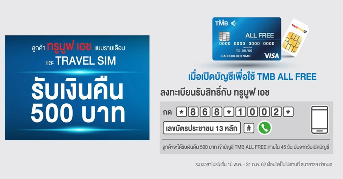 รายละเอียดโปรโมชั่น - สำหรับลูกค้า ทรูมูฟ เอช แบบรายเดือน และ ทรูมูฟ เอช TRAVEL SIM ที่เปิดบัญชี TMB ALL FREE พร้อมบัตรเดบิต ระหว่างวันที่ 15 พ.ค. - 31 ก.ค. 62 ที่สาขา TMB ทั่วประเทศ ธนาคารฯ จะทำรายการคืนเงิน 500 บาท เข้าบัญชี TMB ALL FREE ของลูกค้า ภายใน 45 วัน นับจากวันเปิดบัญชี TMB ALL FREE และเปิดใช้งานบริการตามเงื่อนไขโปรโมชั่น