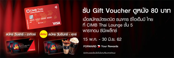- หรือ สมัครบัตรเดบิตธนาคาร ซีไอเอ็มบี ไทย ที่บริเวณ CIMB Thai Lounge พับบลิคเลาจน์ กลางโถงชั้น 5 พารากอน ซีนีเพล็กซ์ รับ Gift Voucher ดูหนัง 80 บาท จำนวน 2 ใบ ทุกวันเสาร์-อาทิตย์ ของเดือนพฤษภาคม - มิถุนายน 2562